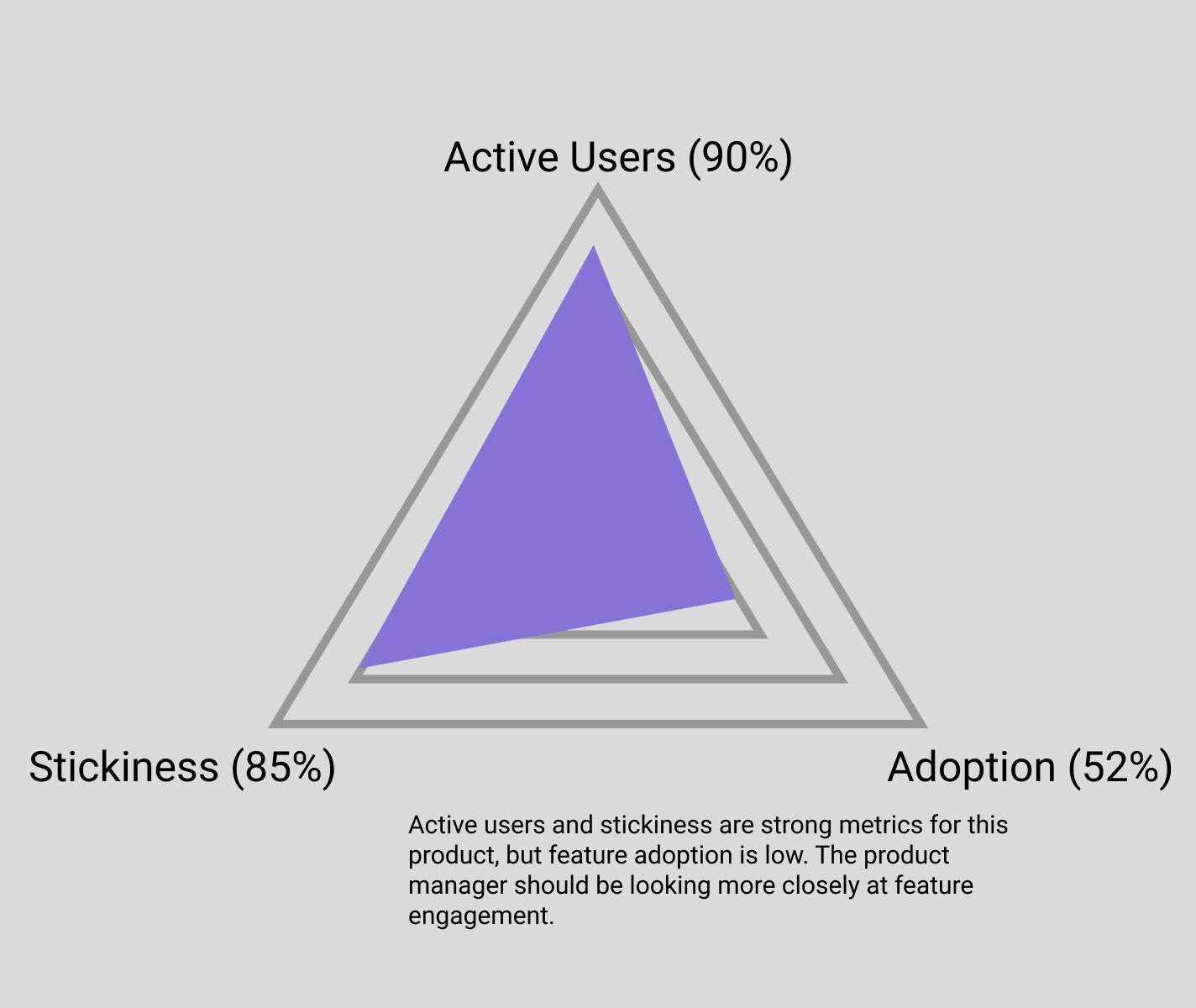 Adoption represents the number of users using key features in your product. Each new feature presents an opportunity for additional customer value. Low adoption implies that you’re offering something which users don’t need, or that there’s something wrong with the feature itself. High adoption means users are flocking to a new feature.