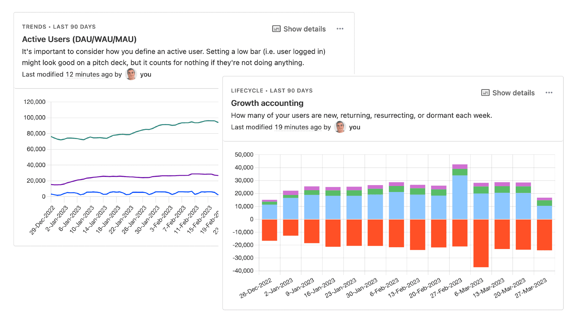 To use this template, go to the Dashboards tab, click the "New dashboard" button, and select "Growth analytics dashboard" from the modal.